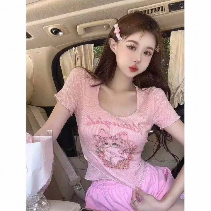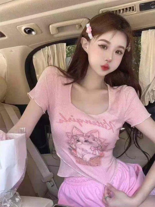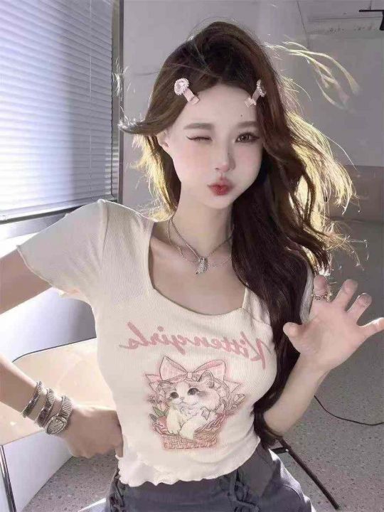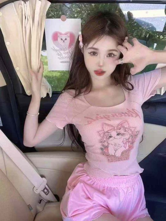 [烟花][烟花]夏纯欲甜辣妹性感短款上衣整款303件,卡通可爱猫咪正肩短袖t恤女设计感小众,独立包装,粉色较多,分货➕1