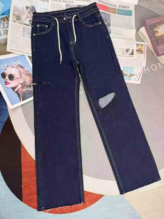 高腰绑带宽松破洞女士弹力牛仔裤,单款单色,独立包装...