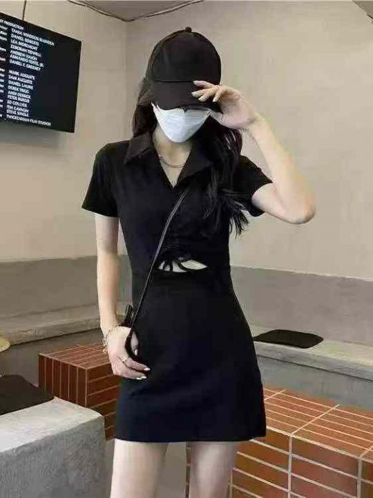 夏季新款赫本风高级感收腰显瘦抽绳V领褶皱小黑裙,独...
