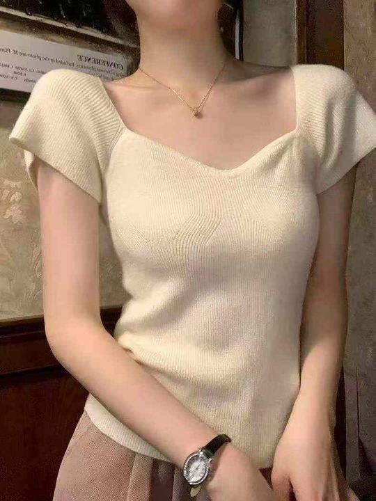夏季新款网红法式气质弹力修身显瘦辣妹针织小衫,独立...