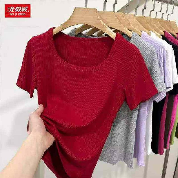 冰丝针织衫短袖T恤女夏装法式性感方领红色显瘦气质上衣,独立包装,800件左...