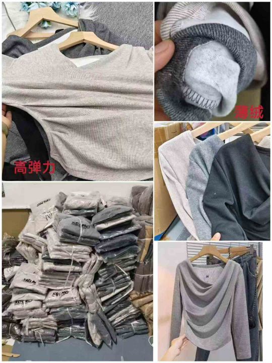 法式荡领辣妹长袖修身显瘦薄绒内搭打底衫上衣,独立包装,整款三色,码数S~XL,弹力好,数量235件,分货加1