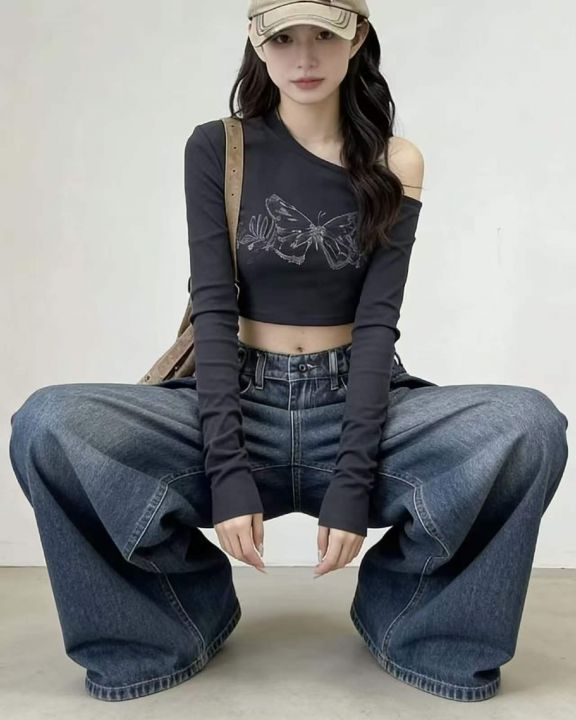 春季新款网红复古洗水棉可调节直筒阔腿牛仔裤,独立包...