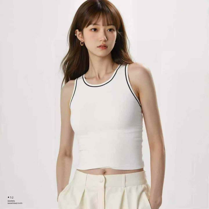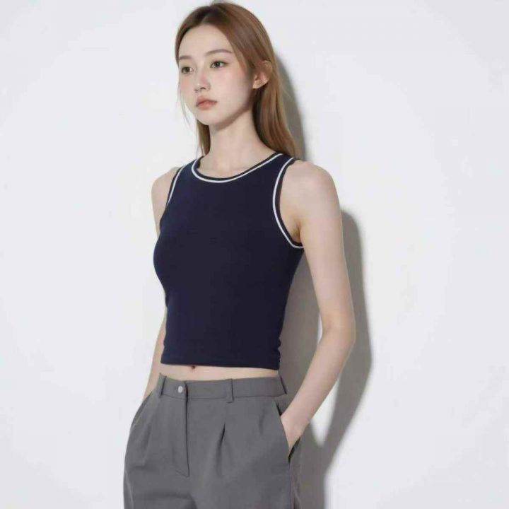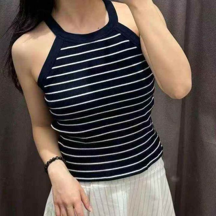 日单女装夏季带运动辣妹风挂脖条纹和净色打底背心,纯...