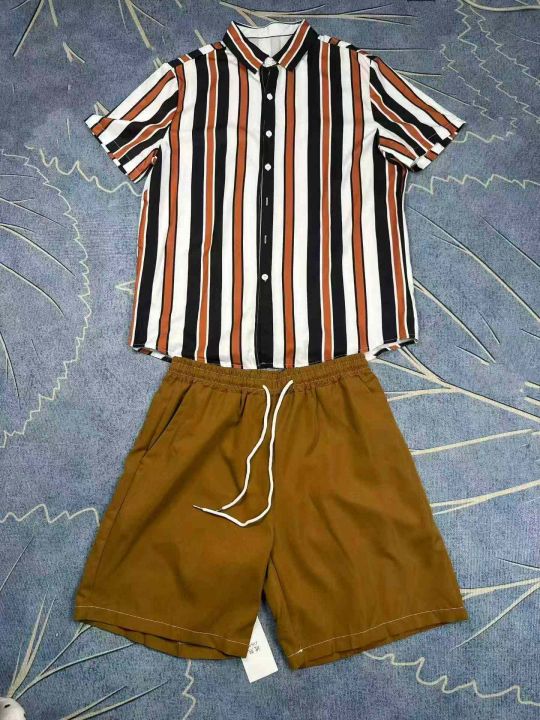 亲肤中性衬衫潮 亮色款复古宽松休闲条纹短袖衬衣套装...