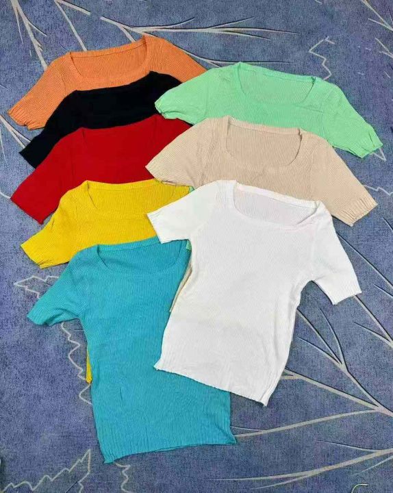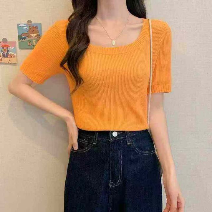 冰丝针织衫短袖T恤女夏装法式性感方领红色显瘦气质上衣,独立包装,800件左右,清5.8,分➕0.5