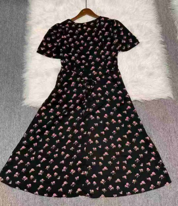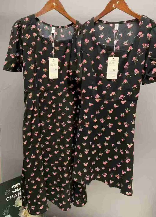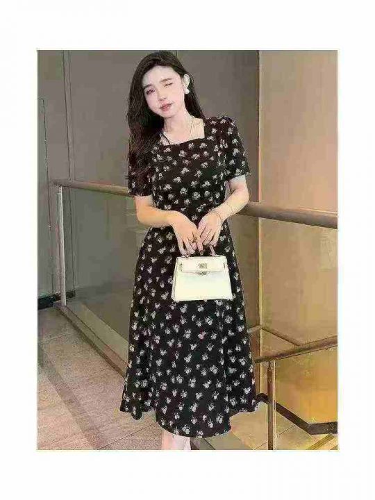 碎花裙女夏季新款女长款修身显瘦方领短袖小黑裙子法式收腰连衣裙260件,独立包装带吊牌,尺码S-3XL货品干净整洁,全清福利价10.8元