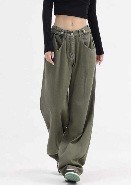 春季新款网红美式复古垂坠感直筒宽松日系工装军绿色直...