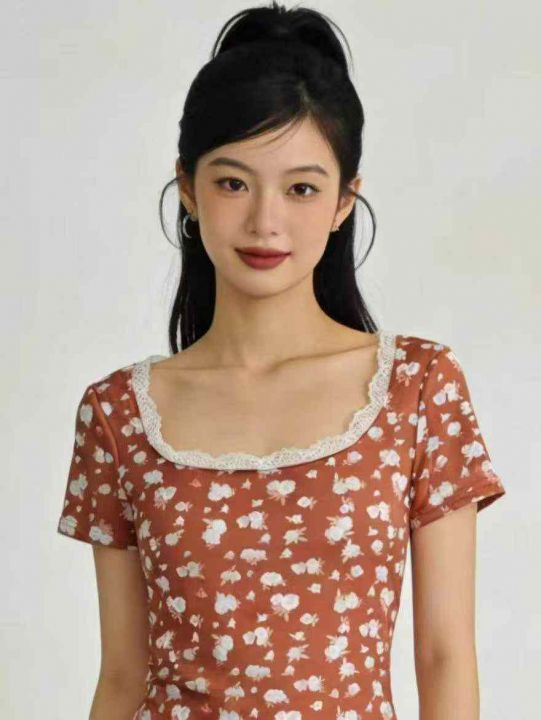 2.9清电商仓回收700件辣妹复古碎花蕾丝纯欲短袖T恤,...