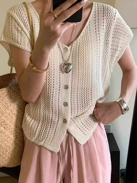 夏季新款法式纯色v领宽松镂空设计感单排扣洋气冰丝短...