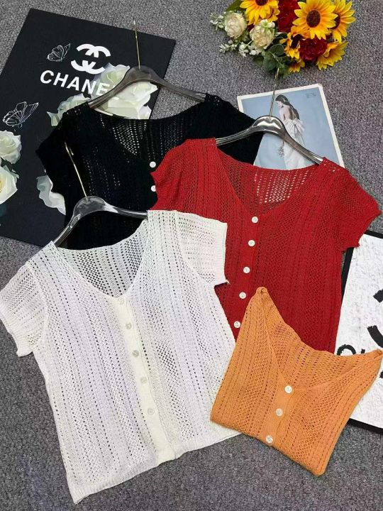 夏季新款法式纯色v领宽松镂空设计感单排扣洋气冰丝短袖时尚减龄针织开衫,独立包装,均码面料柔软舒适,单款多色,91件,全清5.9元超低价秒杀!