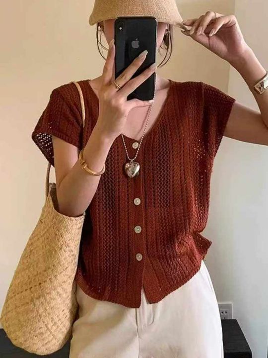 夏季新款法式纯色v领宽松镂空设计感单排扣洋气冰丝短袖时尚减龄针织开衫,独立包装,均码面料柔软舒适,单款多色,91件,全清5.9元超低价秒杀!