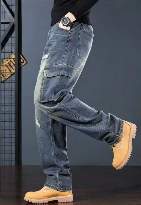 春季新款高端美式个性拼接男款宽松复古蓝设计款多袋工装牛仔裤,独立包装带...