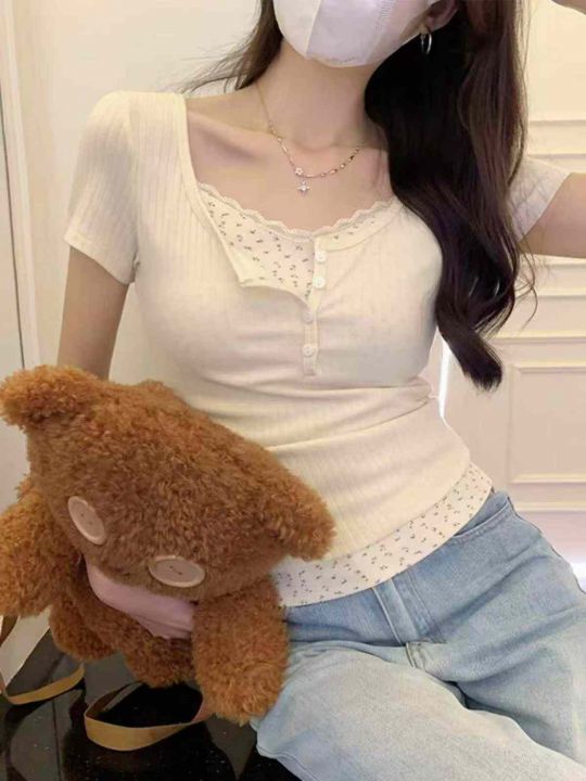 [月亮]:蕾丝花边假两件拼接碎花辣妹T恤
