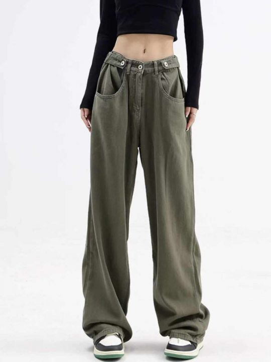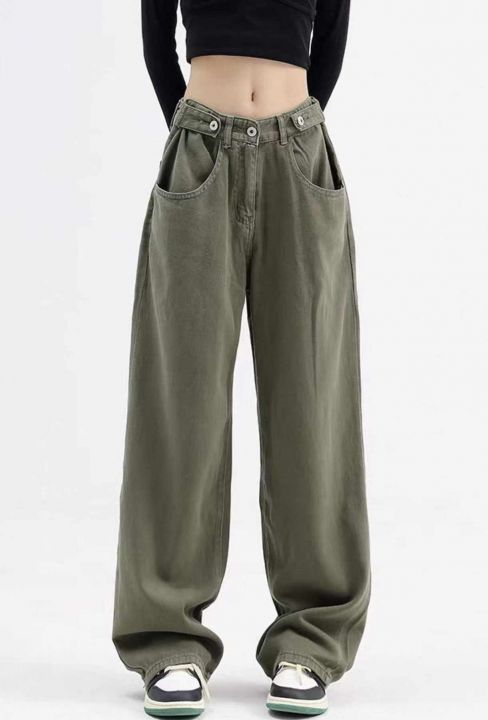 春季新款网红美式复古垂坠感直筒宽松日系工装军绿色直...