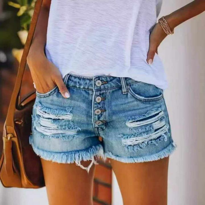 夏季新款品牌外贸原单美式宽松多扣设计款毛边牛仔短裤...