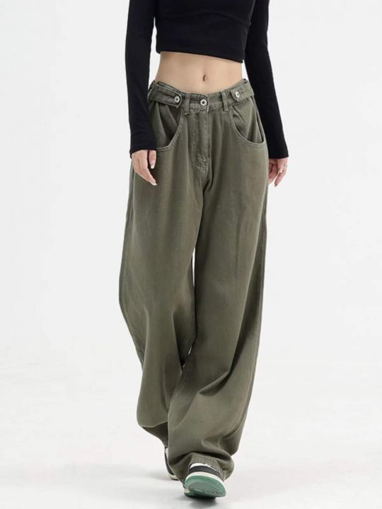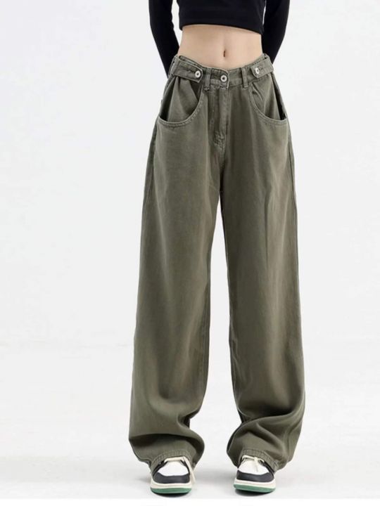 春季新款网红美式复古垂坠感直筒宽松日系工装军绿色直...