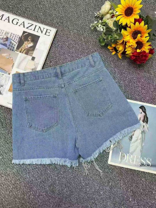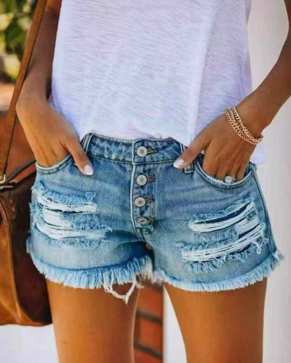 夏季新款品牌外贸原单美式宽松多扣设计款毛边牛仔短裤...