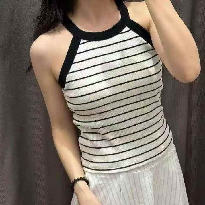日单女装夏季带运动辣妹风挂脖条纹和净色打底背心,纯...