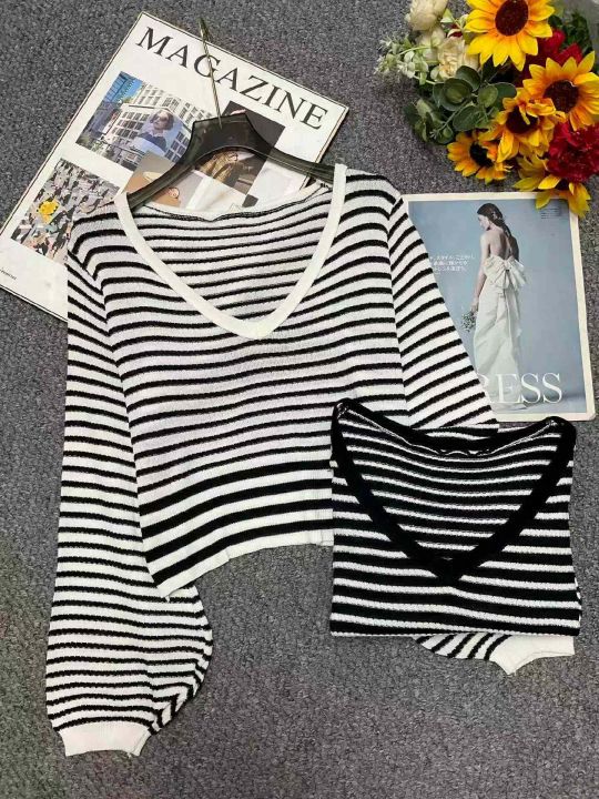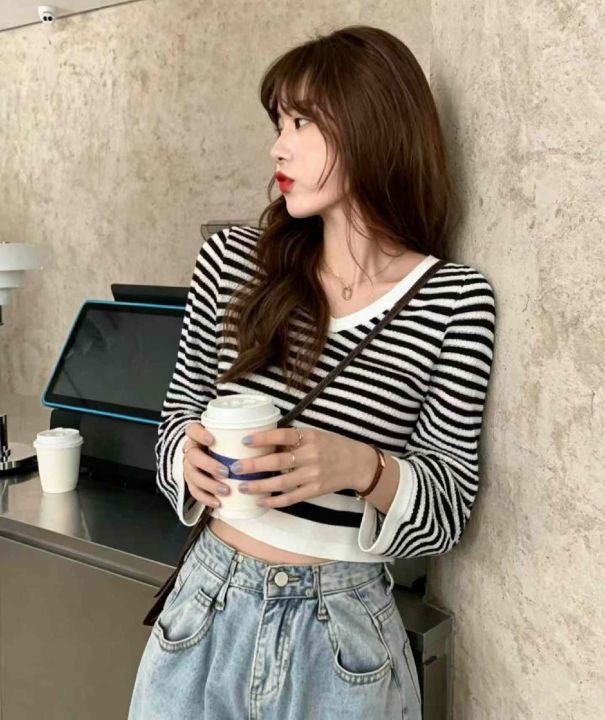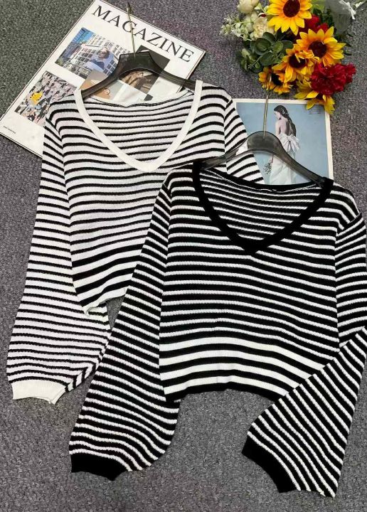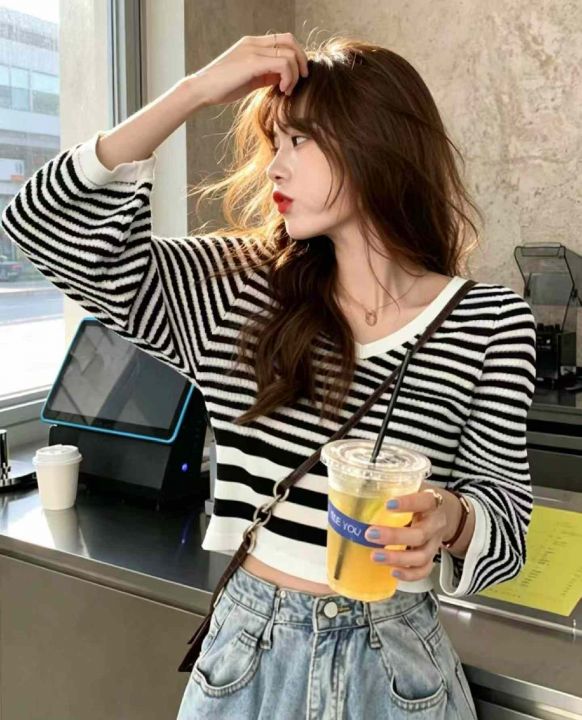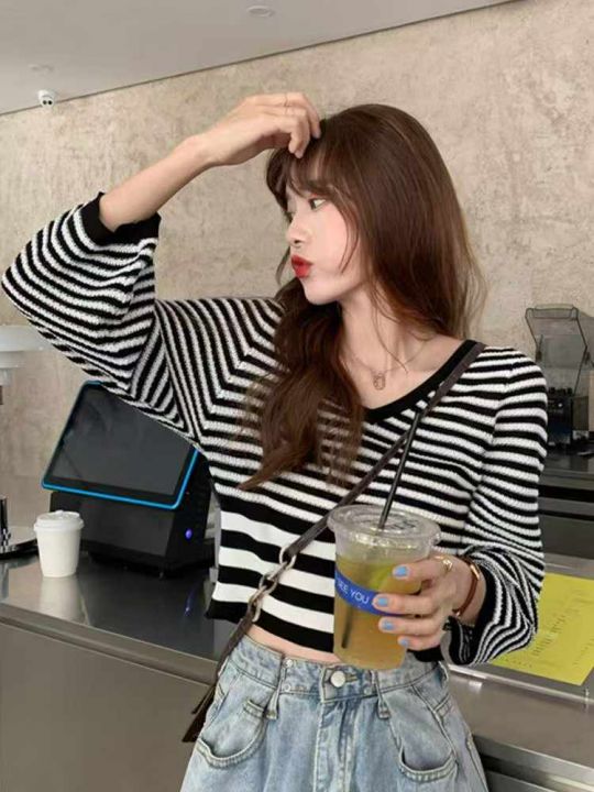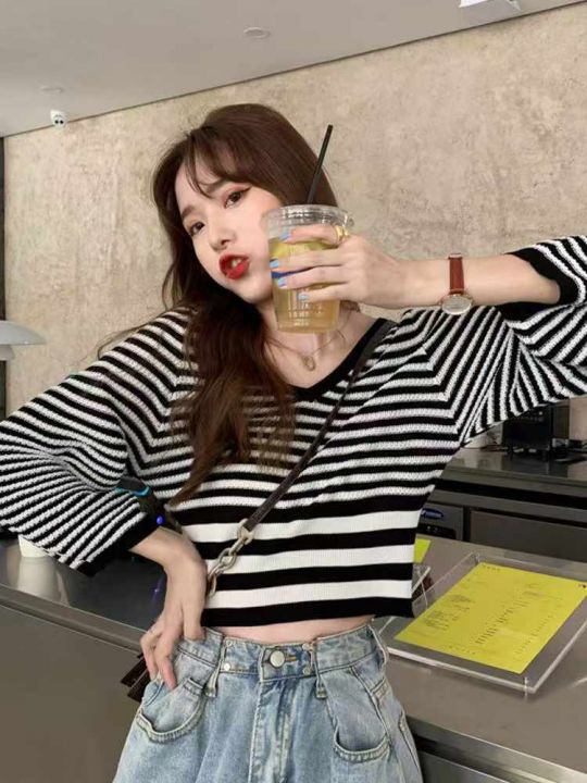 秋季新品撞色条纹宽松慵懒风短款针织V领套头毛衣,独...