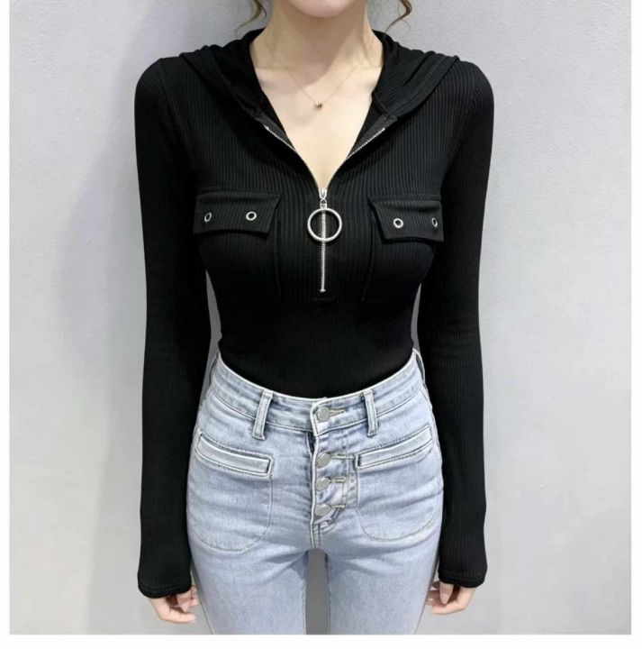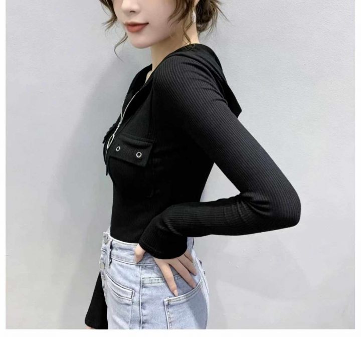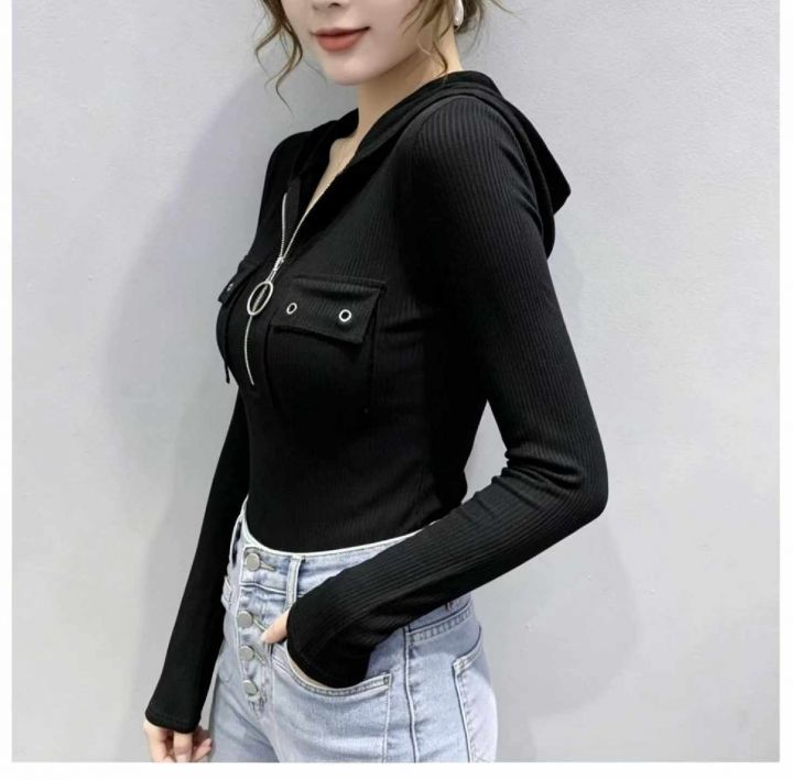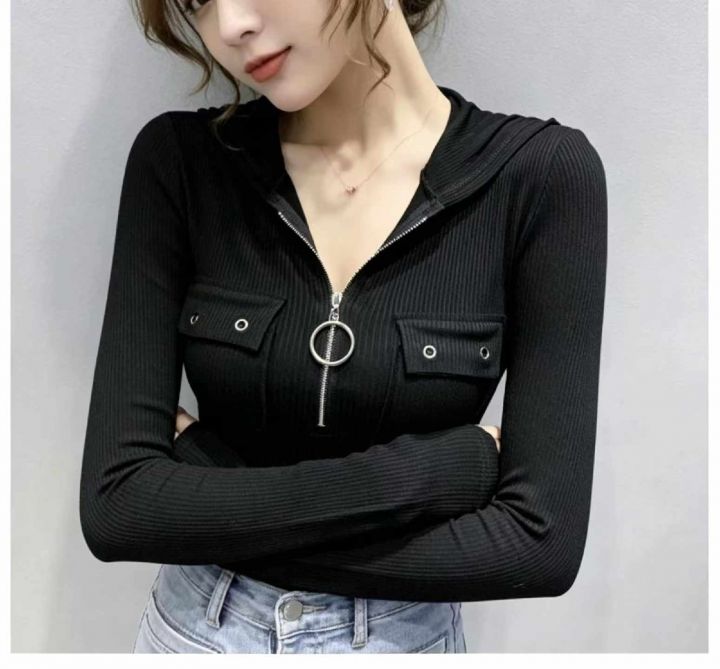 春季新款半拉链纯欲风性感显胸大弹力修身显瘦洋气连帽...