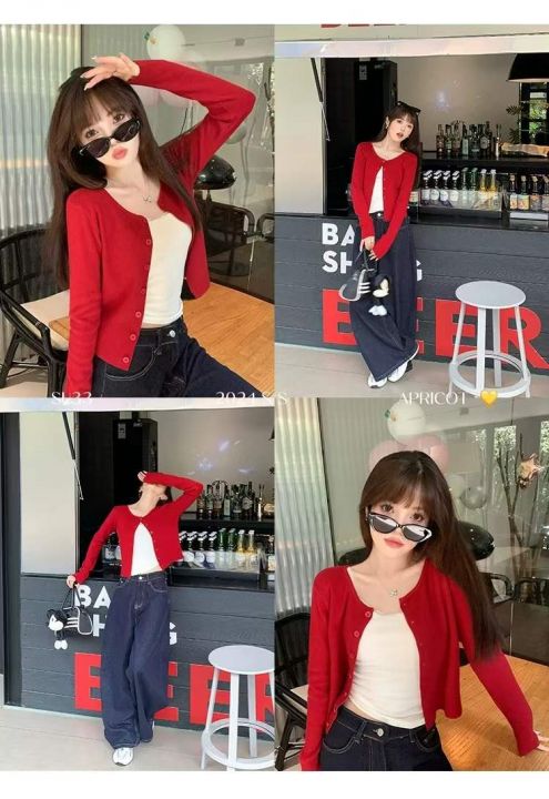 春季新款网红复古红色净版简约长袖针织开衫,独立包装...