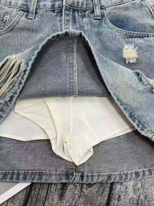 夏季韩版高腰a字牛仔短裙裤女显瘦毛边破洞包臀半身裙...