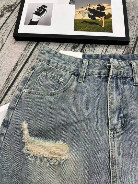 夏季韩版高腰a字牛仔短裙裤女显瘦毛边破洞包臀半身裙...