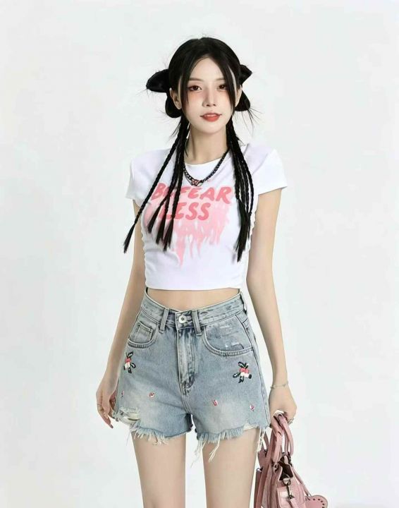 高腰弹力重工刺绣牛仔短裤女夏季新款显瘦小众设计感短...