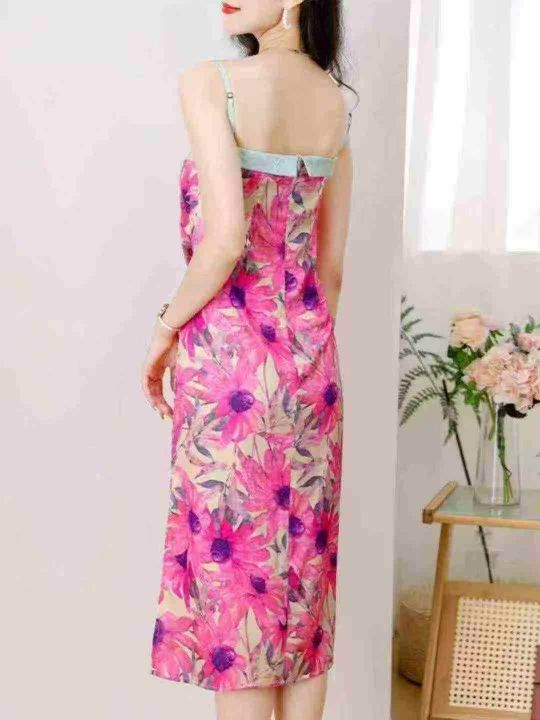 法式复古碎花拼接吊带连衣裙女士夏季新款气质修身高端...