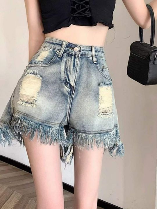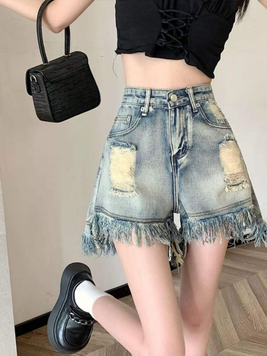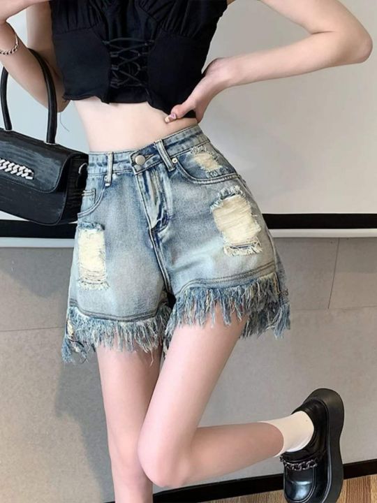 南城高品质辣妹破洞牛仔短裤女夏季新款流苏高腰美式大...
