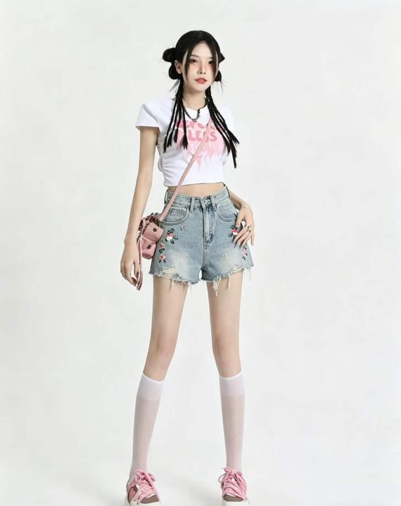 高腰弹力重工刺绣牛仔短裤女夏季新款显瘦小众设计感短...