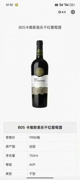 法进国口红卡酒维斯,14.5度。一箱6瓶,货发全国。