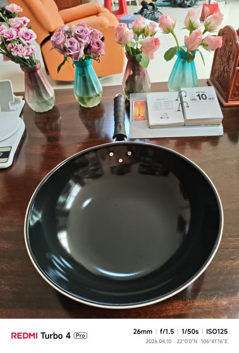 防烫塑胶柄炒锅,锅体直径32cm,高度8.5厘米,连柄长度50cm。