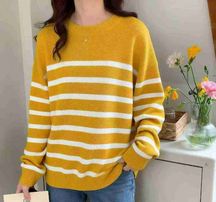 春季新款宽松百搭撞色条纹圆领套头毛衣,独立包装,均码面料软糯舒适弹力大...