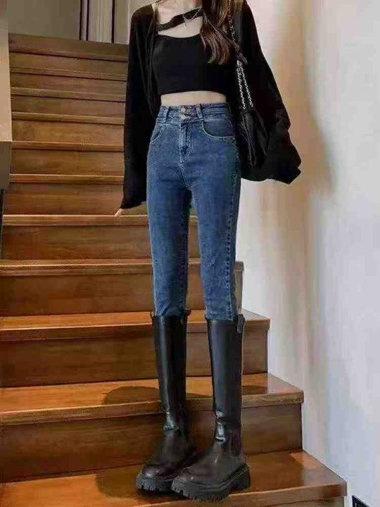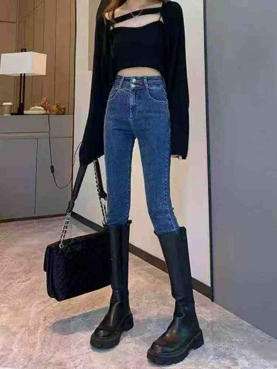 深蓝色高腰弹力牛仔裤女新款显瘦紧身修身小脚铅笔裤子...