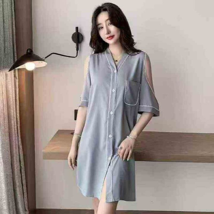 ① 网红冰丝性感露肩韩版宽松家居睡裙!独立包装,整款五色,有部分长袖款,码数M-2XL,数量150件左右,全清6.8元