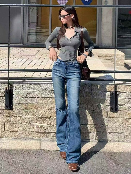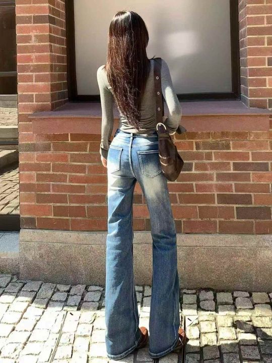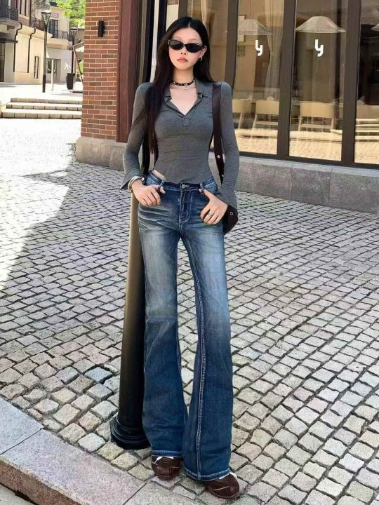 低腰窄版直筒牛仔裤女春夏新款美式复古弹力修身显瘦烟...