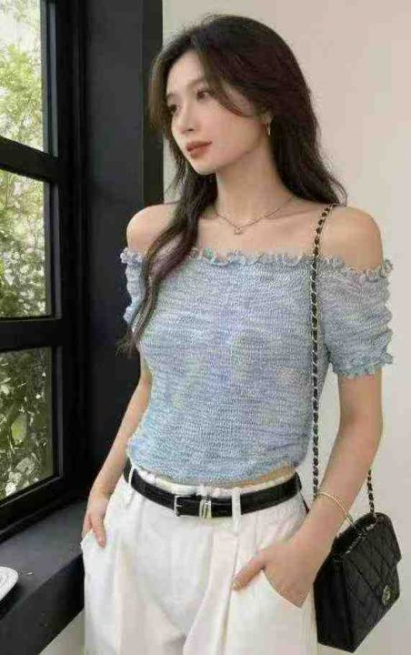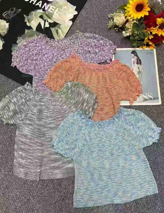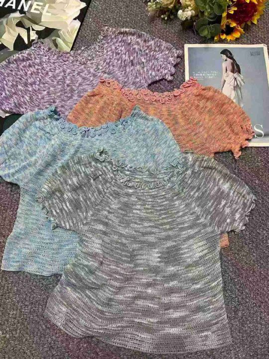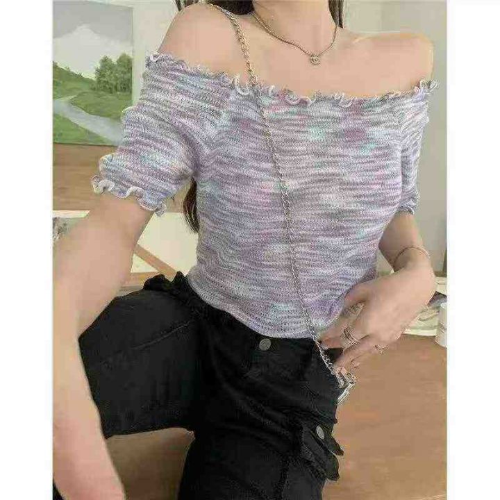 夏季新款段染彩纱木耳边性感辣妹针织短袖t恤,独立包装,均码面料柔软舒适弹力大,1400件,全清4.9元超低价秒杀!分货加一!