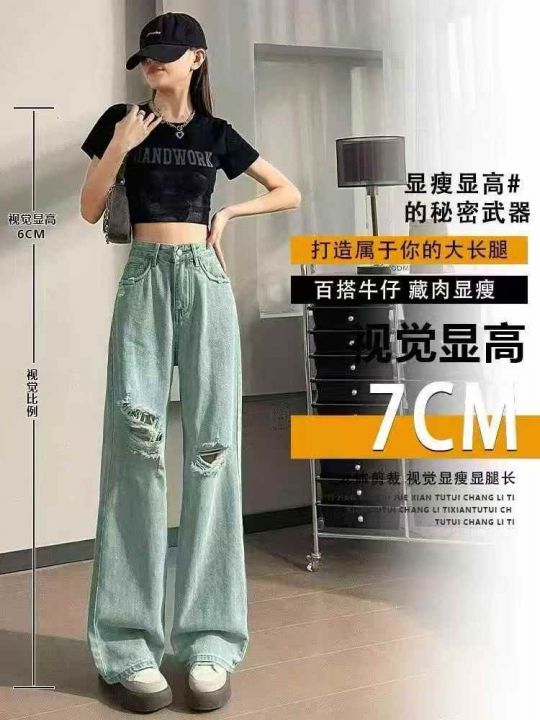 怀旧色阔腿破洞牛仔裤女夏季新款薄款宽松显瘦翡翠绿直筒裤130条全清12.8元...