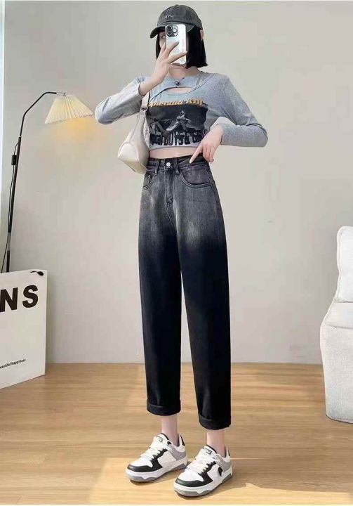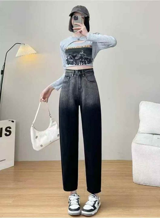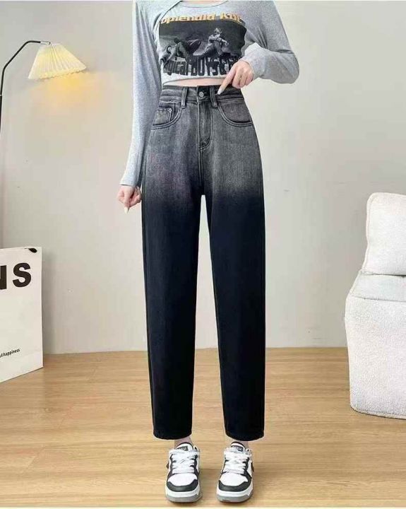 高弹力复古渐变牛仔裤女新款高腰黑色老爹牛仔裤377条...