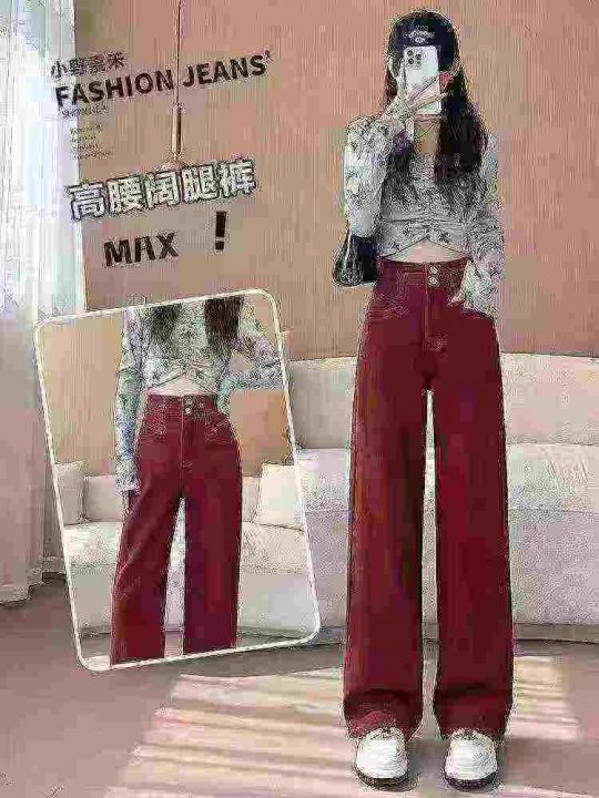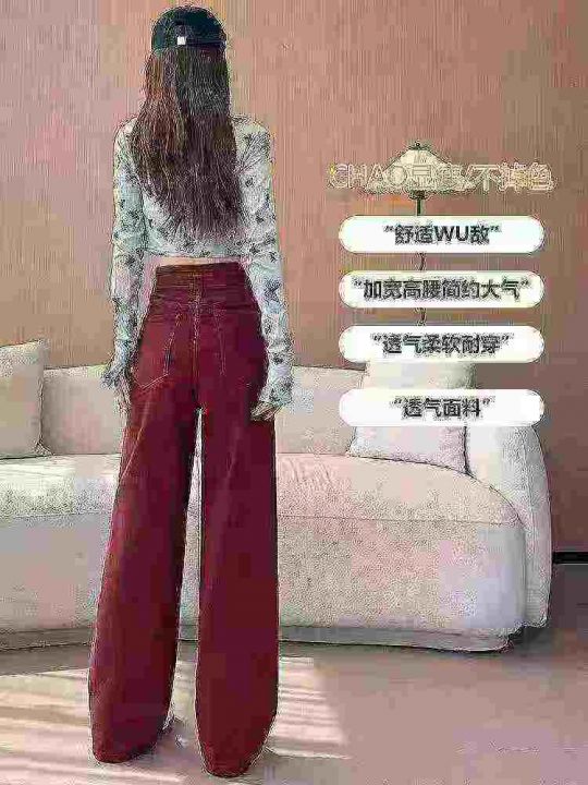 安可拉红阔腿牛仔裤女新款高腰宽松显瘦垂感直筒酒红色...