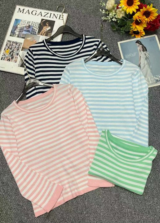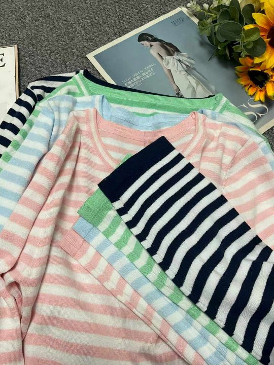春季新款网红复古撞色条纹针织长袖衫,独立包装,均码...