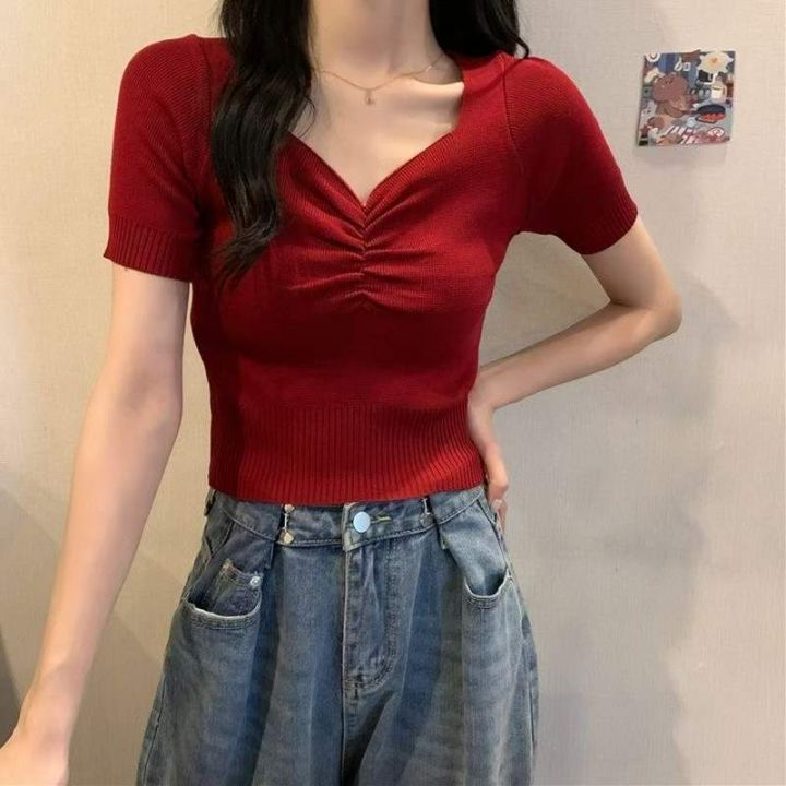 夏季新款网红净版复古设计款韩版V领冰丝针织小衫,独...