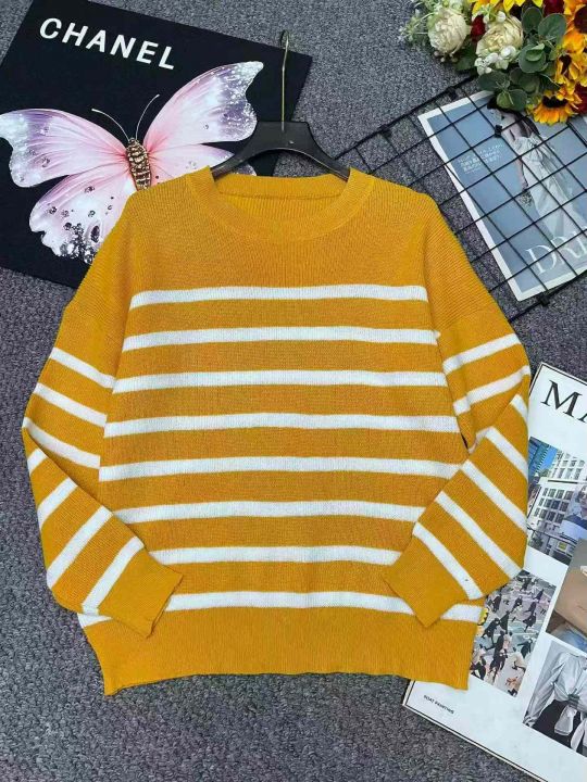 春季新款宽松百搭撞色条纹圆领套头毛衣,独立包装,均...