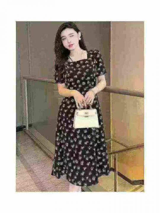 碎花裙女夏季新款女长款修身显瘦方领短袖小黑裙子法式收腰连衣裙260件,独立包装带吊牌,尺码S-3XL货品干净整洁,全清福利价10.8元