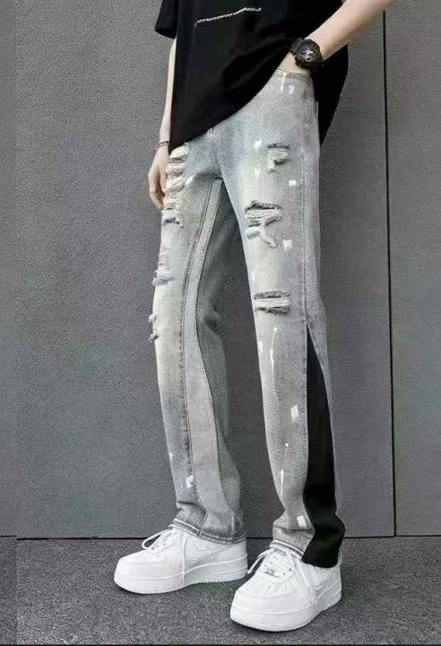 春夏季新款男美潮高街复古泼墨涂鸦直筒微喇叭牛仔裤,...