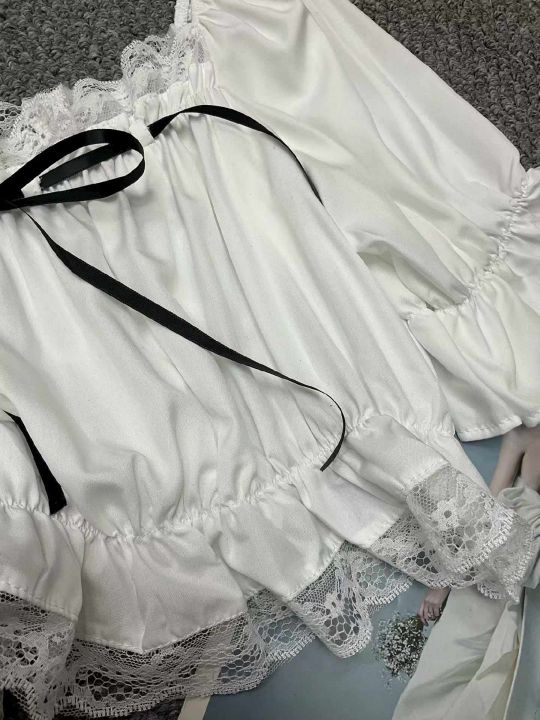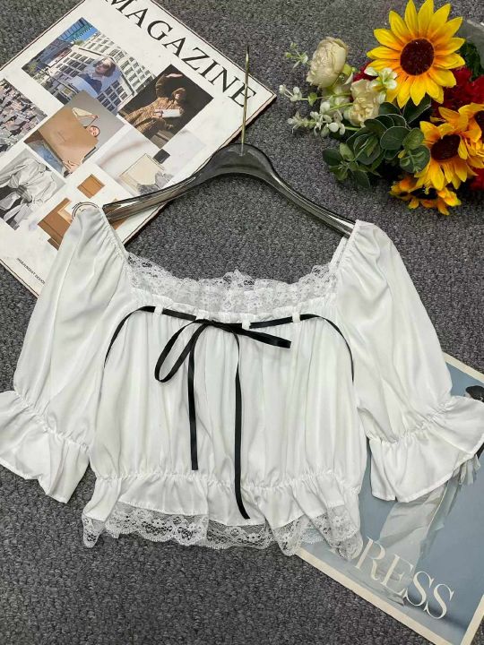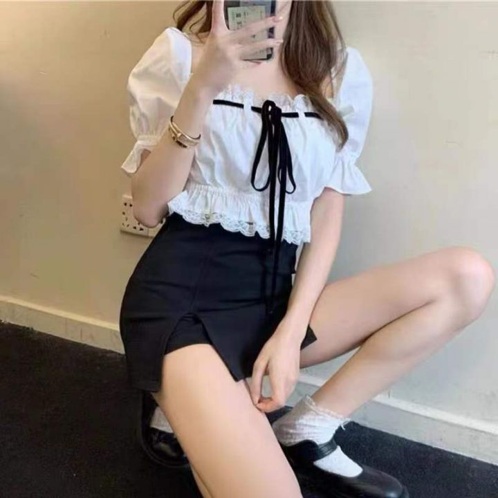 夏季新款韩系纯欲风白色泡泡袖设计感时尚蕾丝拼接小衫...