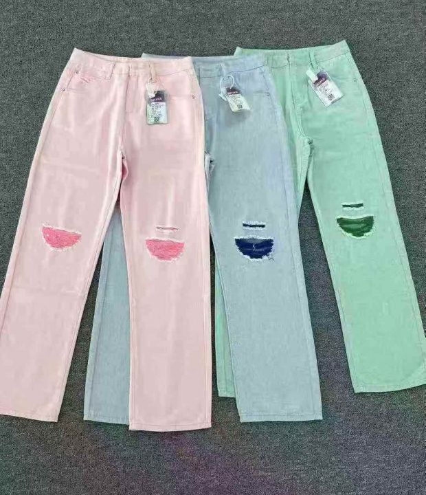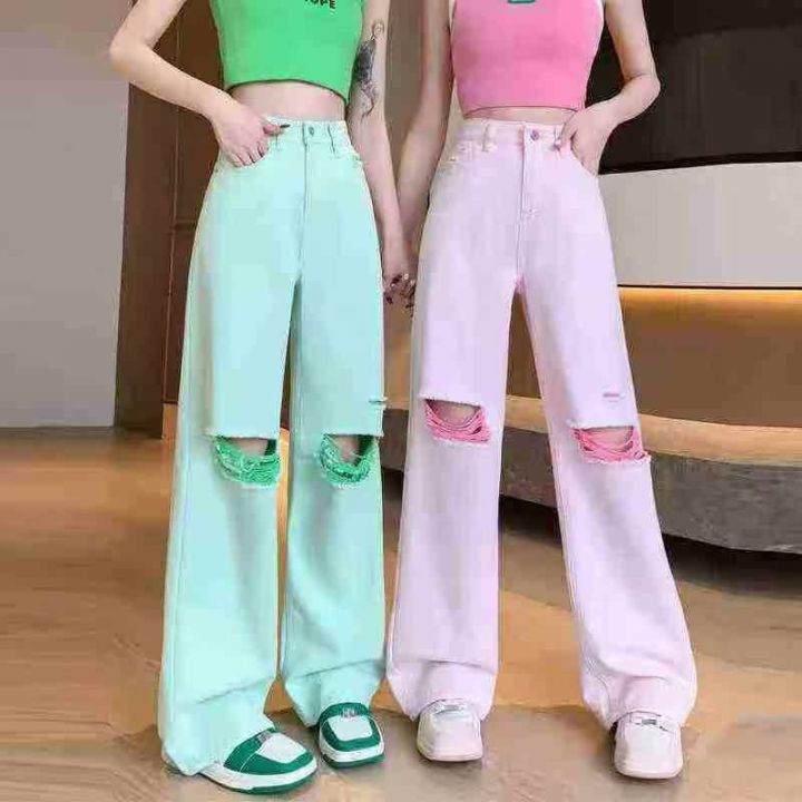 夏日马卡龙色系牛仔阔腿裤☕️1800条全清12.8 分货13.8 码数XS到XXL,有码数清单,两种长度有尺寸表,独立包装,美式复古破洞直筒牛仔裤女高街ins潮设计感小众高腰阔腿拖地裤子