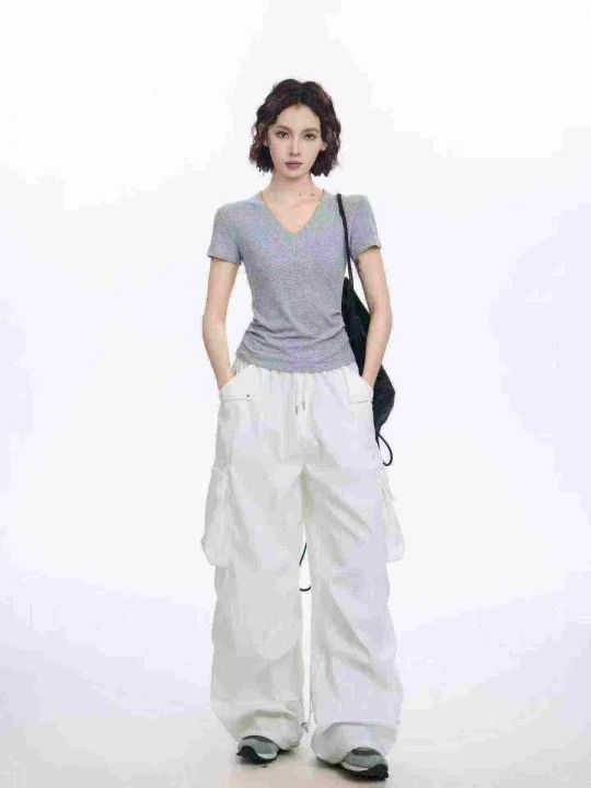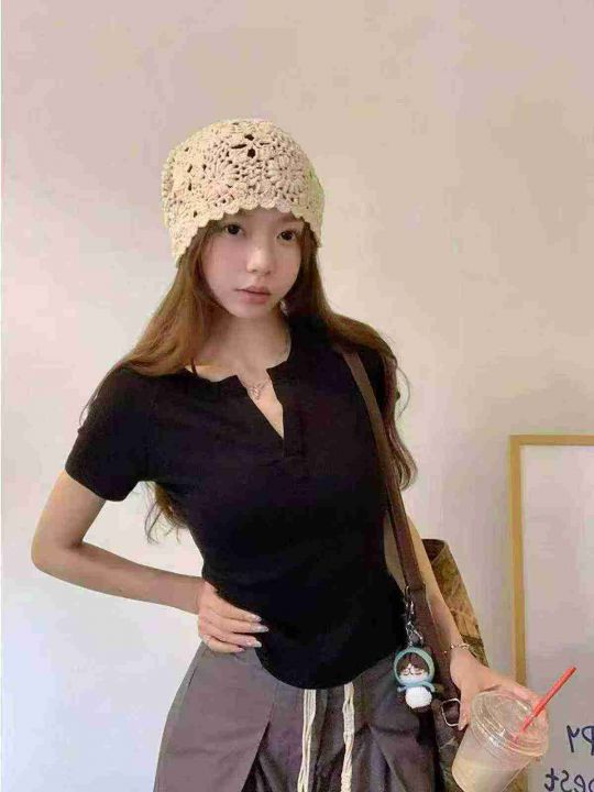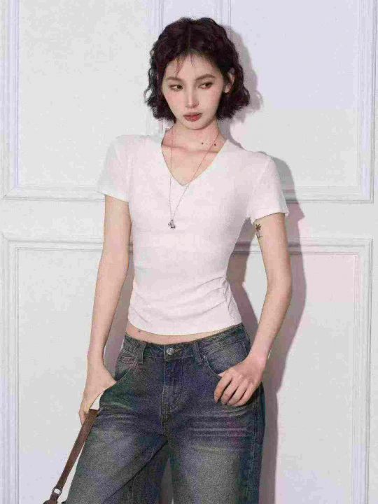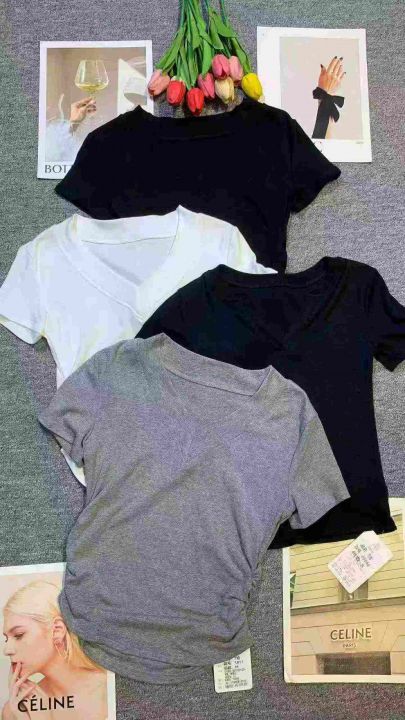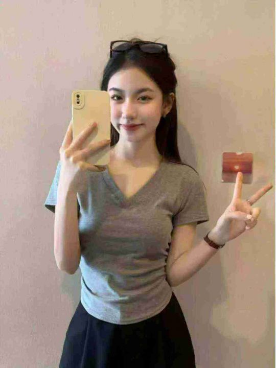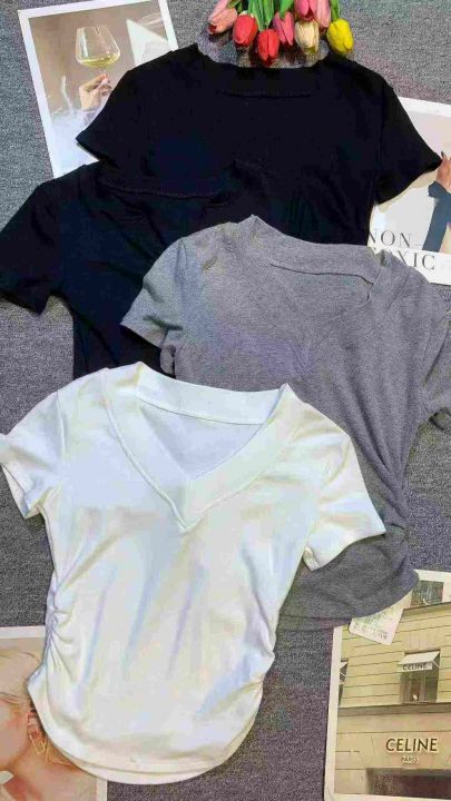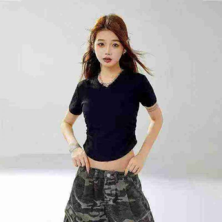 韩版v领纯色正肩褶皱收腰设计感辣妹T恤,[爱心]195件左右,两个款,款号#1011#25044,码数S-XL,穿70-120斤,万佳档口货,原包装️无瑕疵,[666]实体店品质,分货加一